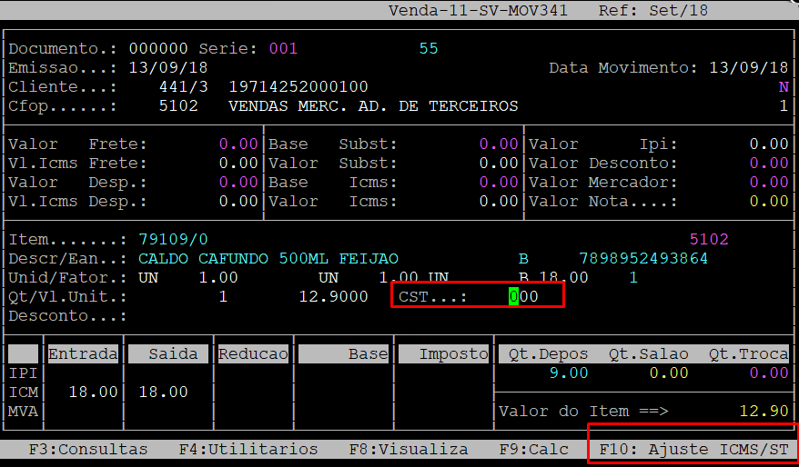Após digitar as informações do item no campo CST será exibido a opção F10: Ajuste ICMS/ICMS ST.