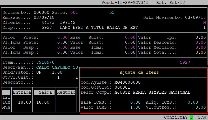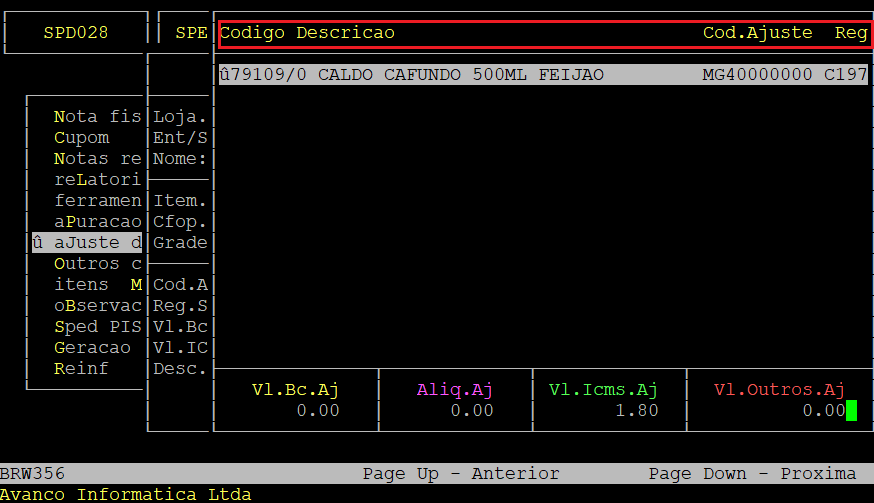 Ao pressionar Enter sobre determinado item será possível visualizar o código, descrição, CFOP e os dados do ajuste lançado, sendo possível alterá-los.