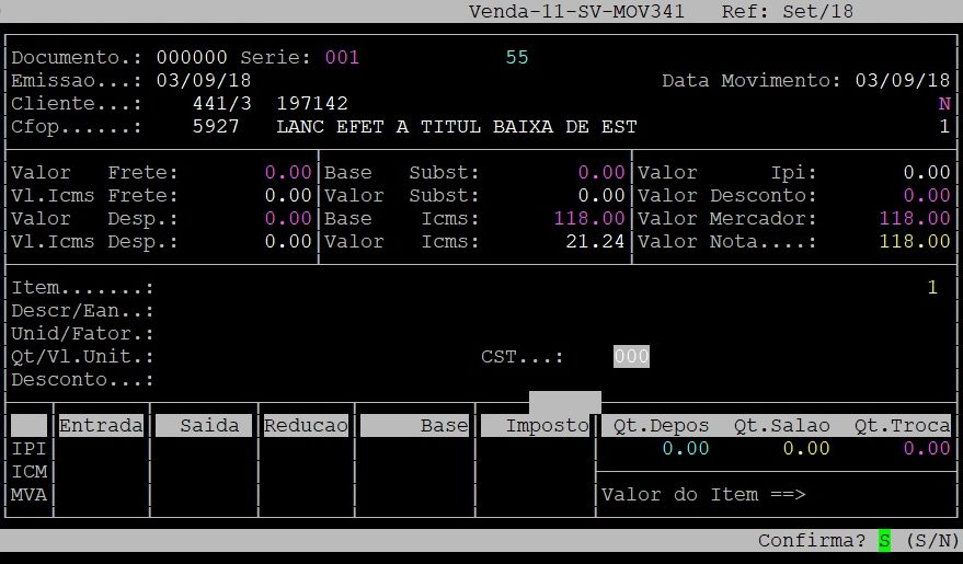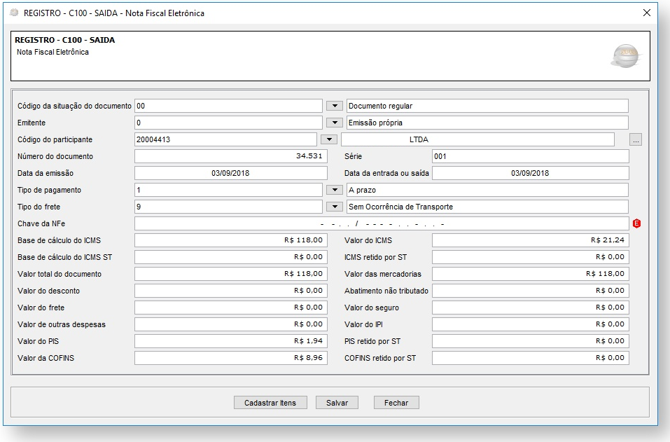 Sendo assim informe o Código da Loja, Mês/Ano, Código do Documento, Série, se consiste em uma nota de Entrada ou Saída, Tipo de Emitente, Movimento, Código do Emitente.