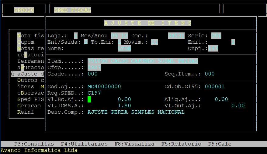 Para informar o Ajuste de ICMS pressione F10, desta forma irá exibir a opção que permite informar os dados do ajuste.