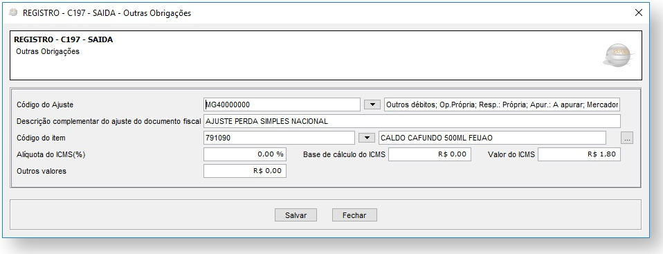 Valor ICMS: | Informe o valor do Ajuste de ICMS. |