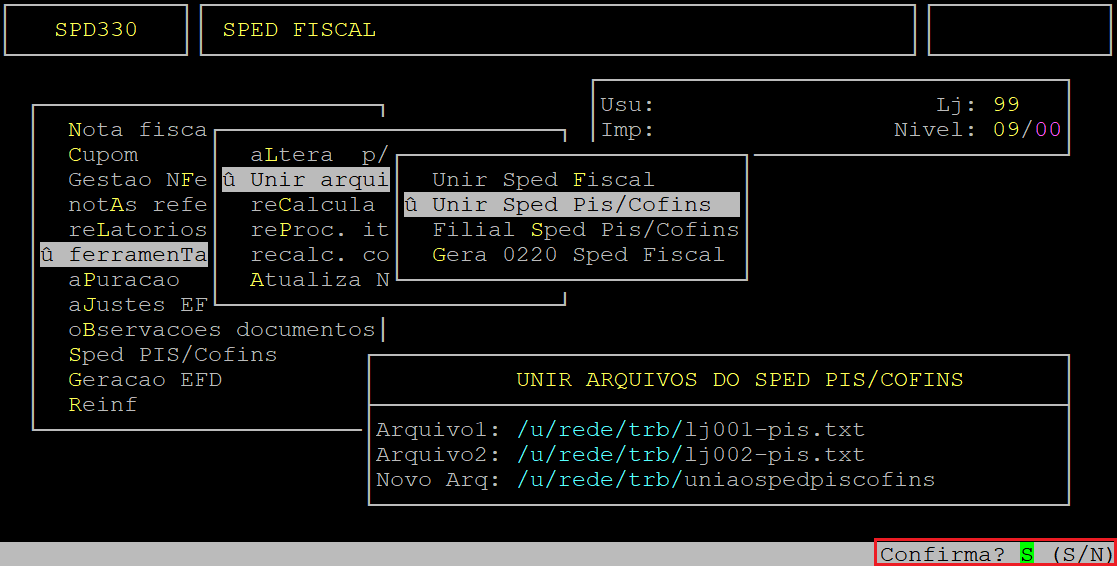Em seguida, será exibida a pergunta " Confirma? ", no qual deverá apertar a tecla Enter ou S para confirmar e realizar a junção dos arquivos do Sped Pis Cofins.