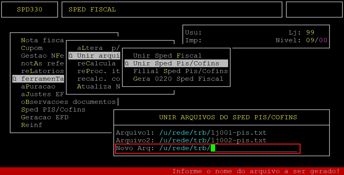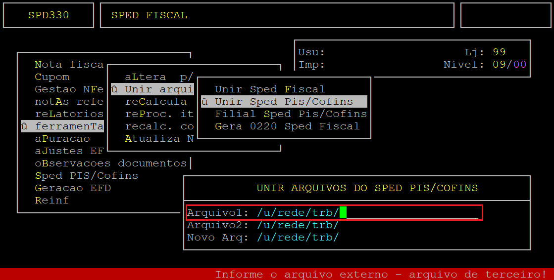 Ao acessar a rotina UNIR ARQUIVOS DO SPED PIS/COFINS, no campo Arquivo1 informe o nome completo do arquivo gerado no sistema de terceiros, previamente salvo na pasta u/rede/trb com a extensão .txt.