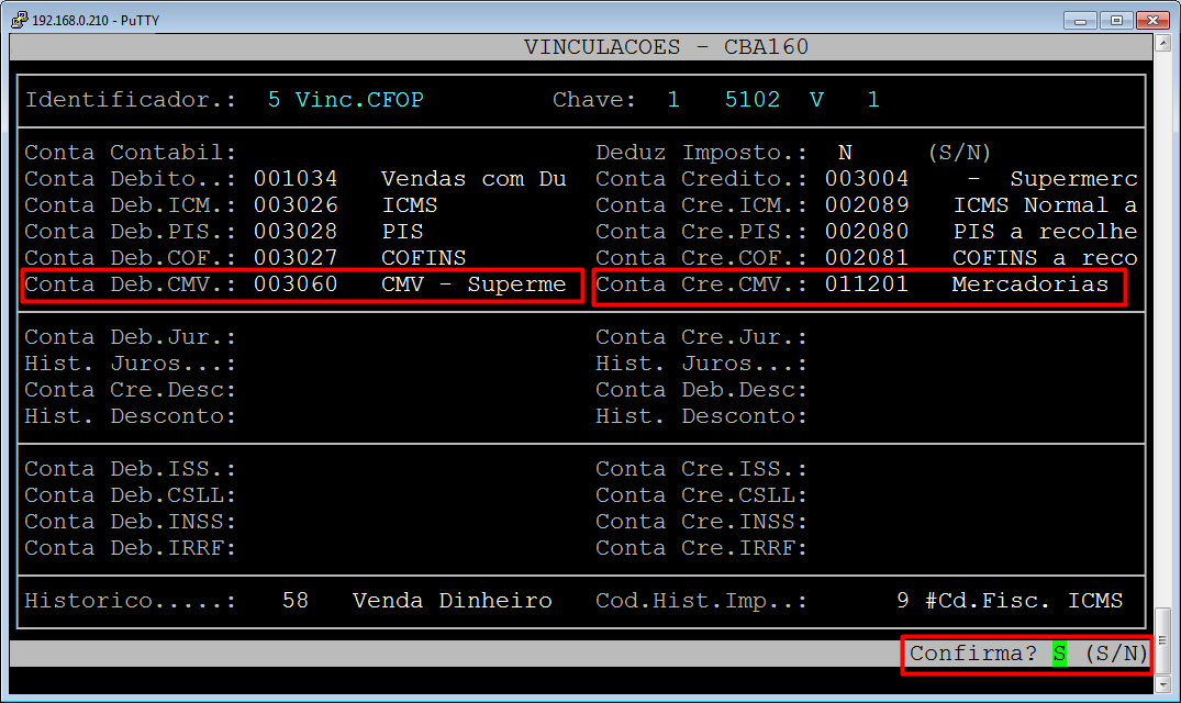 Em seguida informe o sequencial da vinculação (usado caso um mesmo CFOP receba movimentações à vista e à prazo). A tela possui várias contas que podem ser informadas, mas para a rotina de CMV precisamos de 2 em particular, as quais estão destacadas na imagem abaixo. |