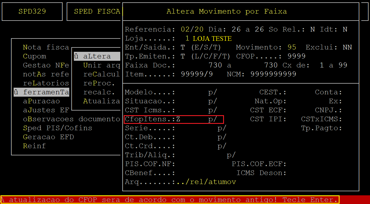 OBSERVAÇÃO: Antes de realizar o procedimento é imprescindível salvar os arquivos de movimento referente ao período que deseja alterar o CFOP: *AAMM* (diretório /u/sist/arqf e /u/sist/arqf ), sendo: AA - ano com dois dígitos e, MM - mês com dois dígitos. |