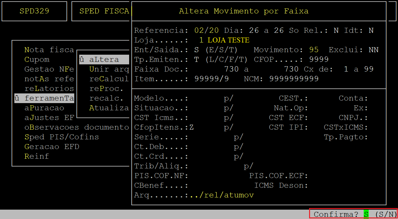 Ao ser exibida a pergunta " Confirma? ", pressione a tecla Enter ou S para confirmar a alteração desejada, conforme o exemplo abaixo.