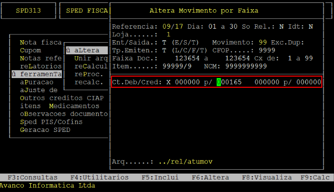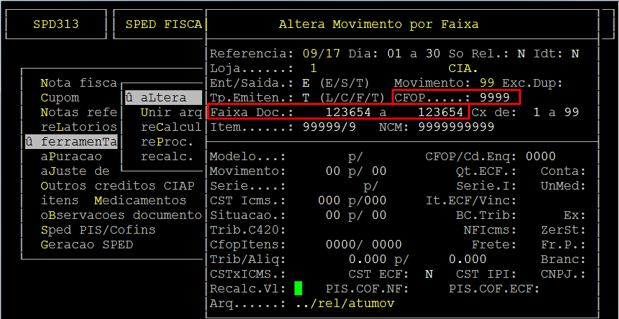 Localização: | SPED Fiscal / Ferramentas / Altera por Faixa |