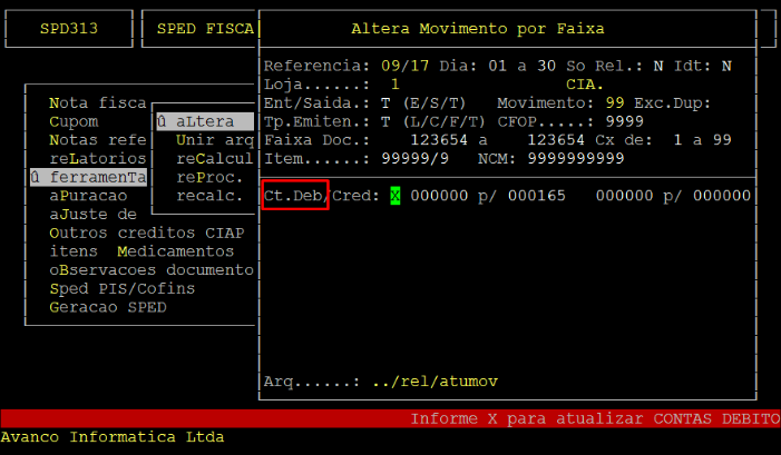 No campo Ct.Deb que está em destaque informe a letra "X" se desejar incluir uma conta Débito/Crédito na movimentação, a rotina pode ser executada para as contas de Crédito ou Débito.