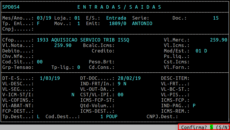 O sistema exibirá a pergunta " Confirma? ", no qual deverá confirmar com tecla Enter ou S.