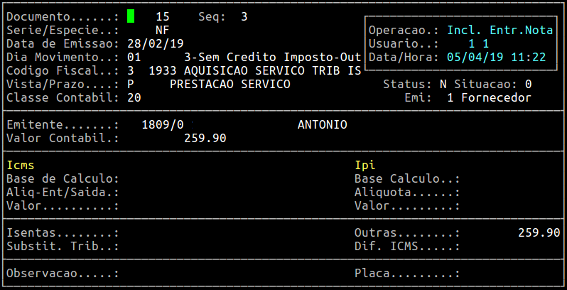 Assim que preencher os campos acima, pressione a tecla Page Down para carregar os dados da nota fiscal. Em seguida, pressione a tecla F6 para regravar a nota na rotina do Fiscal, conforme exemplificado abaixo.