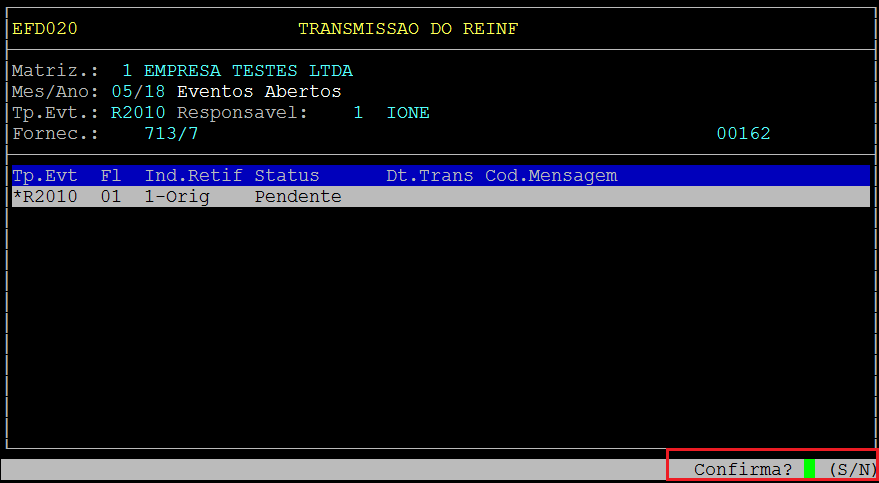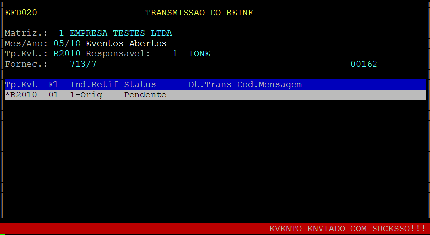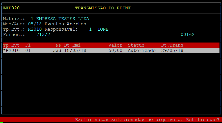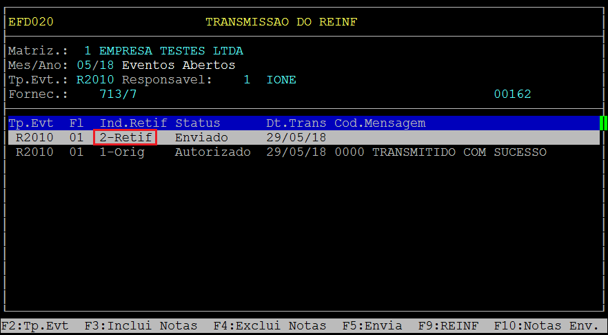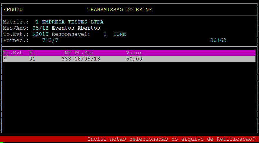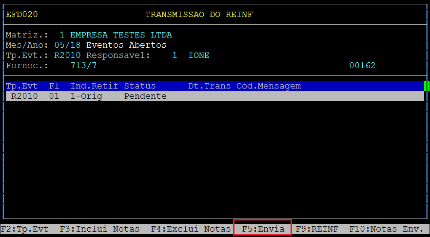 Após confirmar será retornado para a opção de transmitir o arquivo, sendo assim para transmitir o Evento de Retificação pressione F5: Envia.
