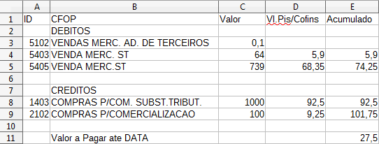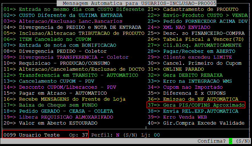 OP: | Informe o código 37 para receber mensagens de informações resumidas de crédito e débito de PIS/COFINS. |