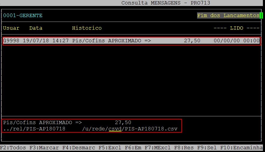 Com a seleção em cima da mensagem é possível visualizar no rodapé a localização da planilha em csv que é gerada com as informações resumidas de crédito e débito de PIS/COFINS, que pode ser encontrada no diretório /u/rede/csvd/ do servidor.