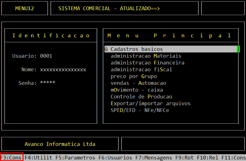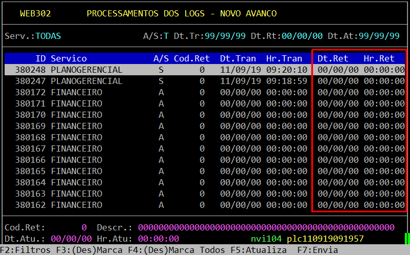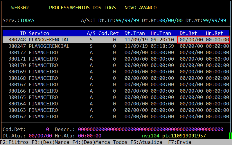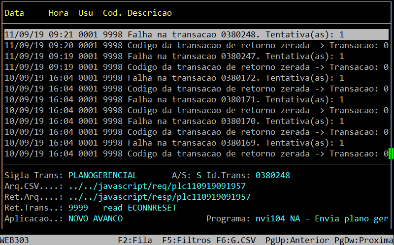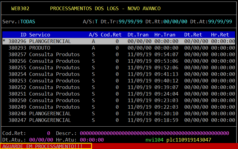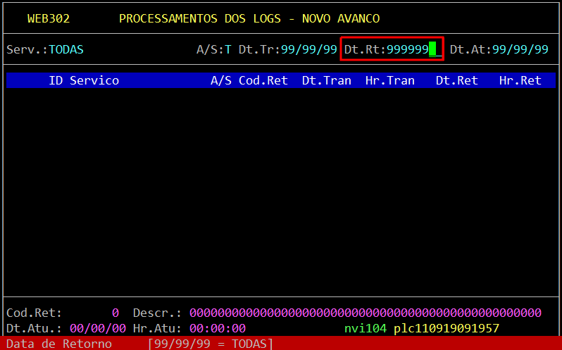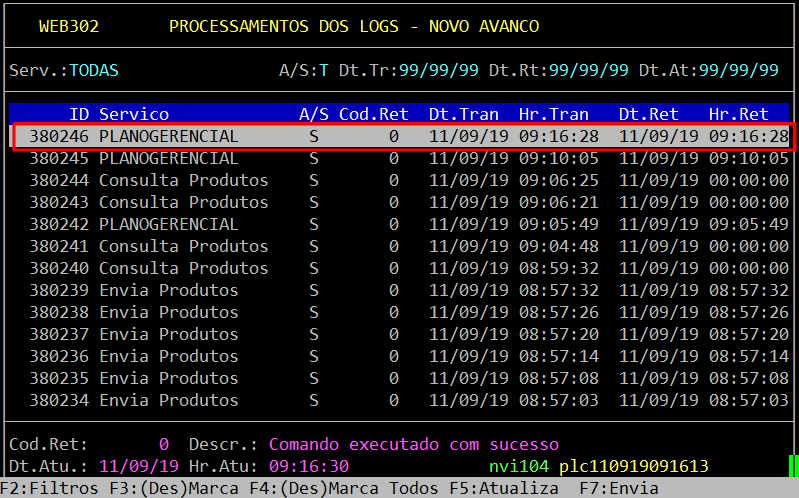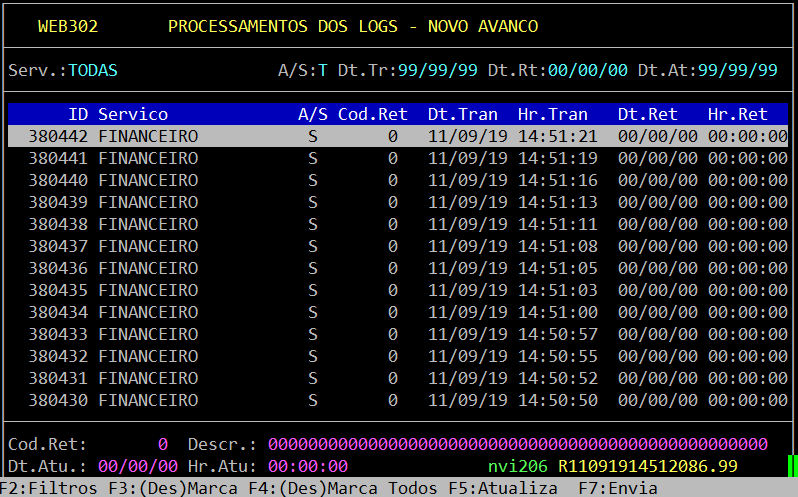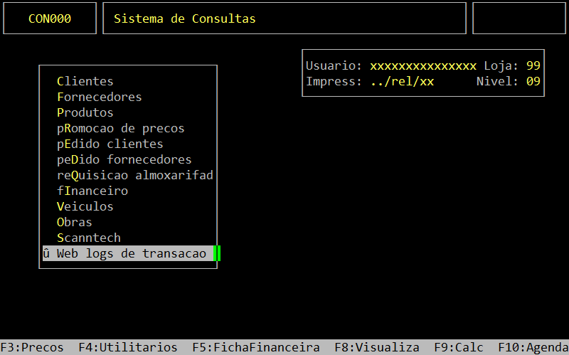 Localização: | Menu principal / F3 / Web logs de transacao |