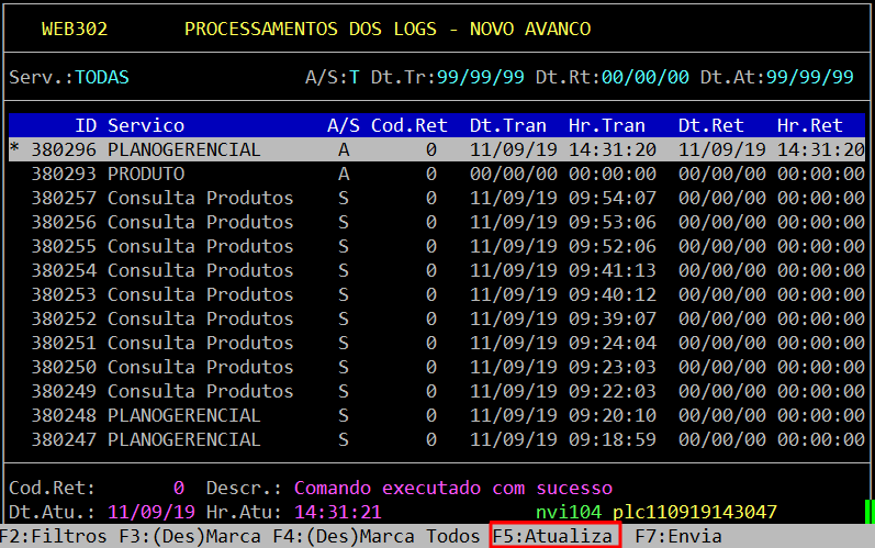 OBSERVAÇÃO: A opção F5:Atualiza também poderá ser utilizada em qualquer tela de consulta de requisições do Novo Avanço, sempre com a função de atualizar os dados referente ao filtro que consta na tela. |