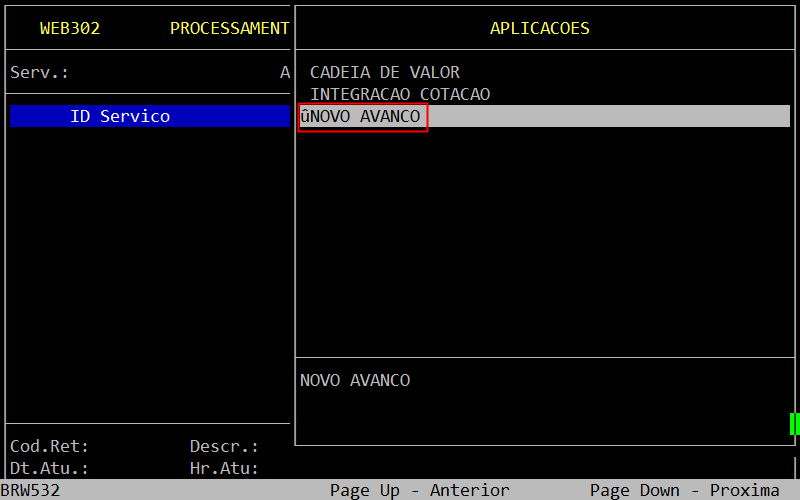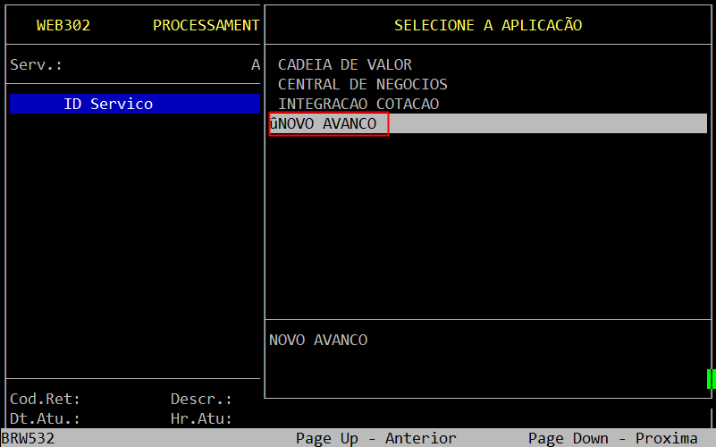 Ao acessar a rotina Processamentos dos Logs - Novo Avanço, selecione a opção Novo Avanco e, em seguida pressione a tecla Enter.