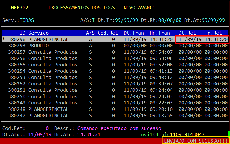 Aguarde até que a mensagem ENVIADO COM SUCESSO seja exibida, conforme o exemplo abaixo. Neste momento, a data e hora da transação e do retorno foram gravadas, pois neste momento a requisição foi enviada ao NOVO AVANÇO.