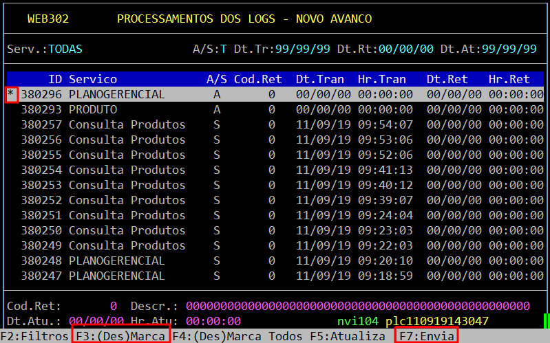 Em seguida, pressione a tecla F3 para marcar a requisição a ser enviada e, depois a tecla F7 para enviá-la. Observe que ao pressionar a tecla F3 um asterisco ( * ) aparecerá ao lado da requisição.