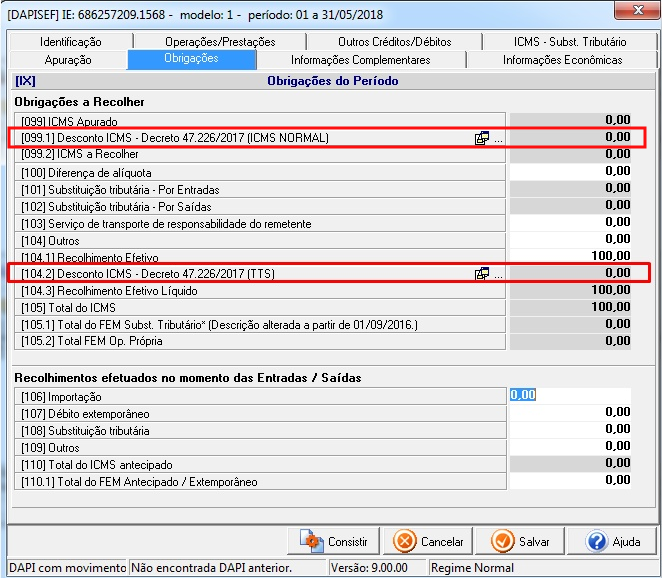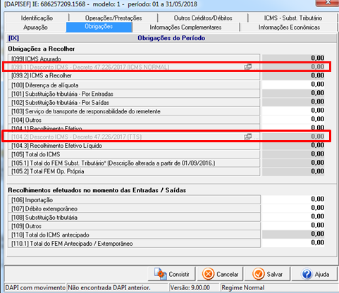 Observação: Quando selecionado N (Não) no campo Aceite, não será necessário nenhuma configuração manual após importar o arquivo no sistema DAPI no Quadro IX - Obrigações do Período, pois os valores correspondentes aos campos das linhas de aceite do termo ficarão desabilitadas. Mas, caso seja selecionado S (Sim), será necessário informar manualmente no DAPI no Quadro IX - Obrigações do Período, os valores correspondentes aos campos das linhas de aceite do termo.