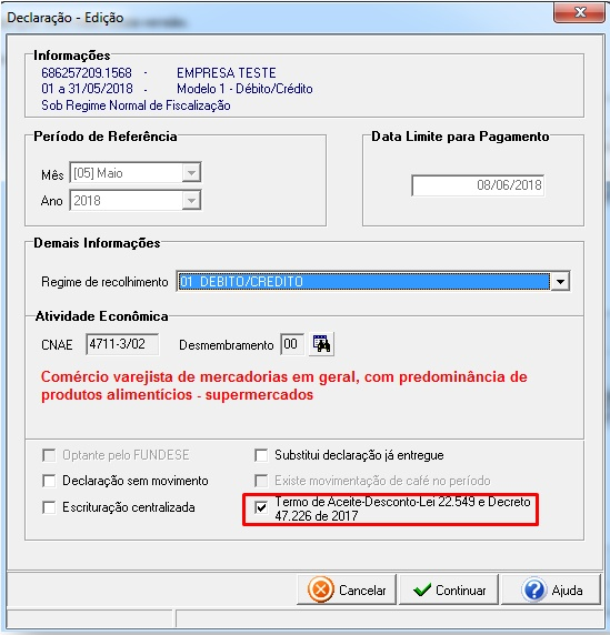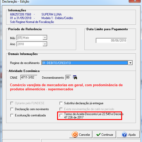 Ao importar o arquivo no sistema DAPI, automaticamente estará marcado na declaração o campo "Termo de Aceite - Desconto - Lei 22.549 e o Decreto 47.226 de 2017".