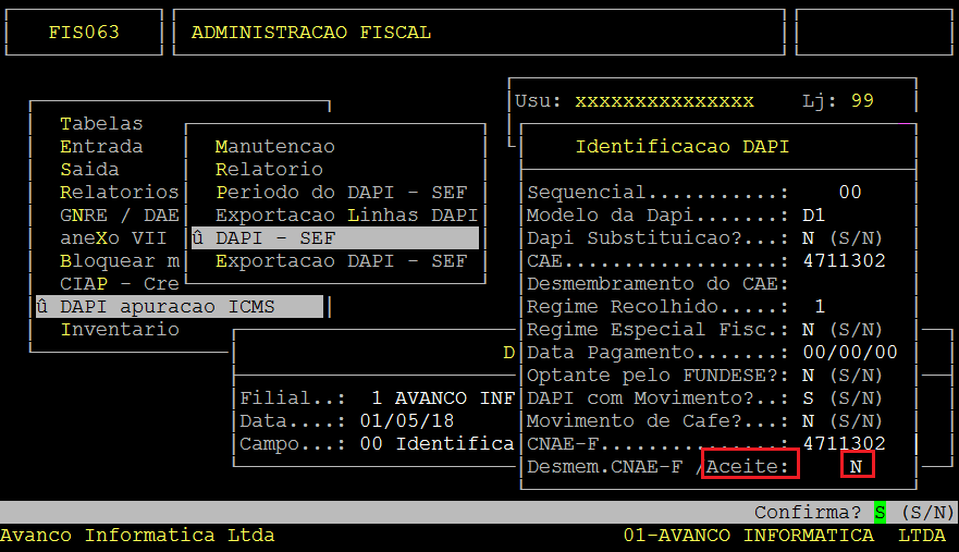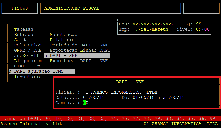 Digite as informações referentes a Filial, período e a linha do DAPI. Na opção: Campo, digite 00.
