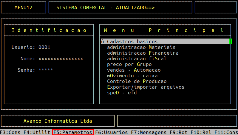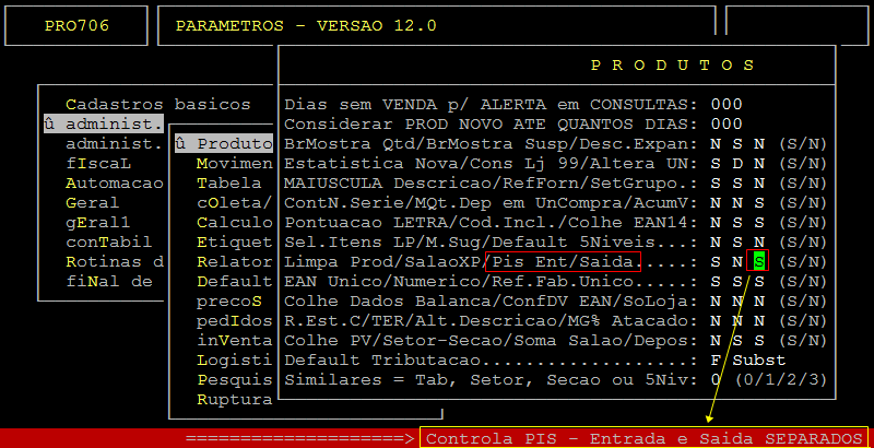 Ao acessar a rotina, pressione a tecla Enter para percorrer pelos campos até chegar no campo Pis Ent/Saida e informe a letra S. Em seguida pressione Enter até confirmar a alteração.