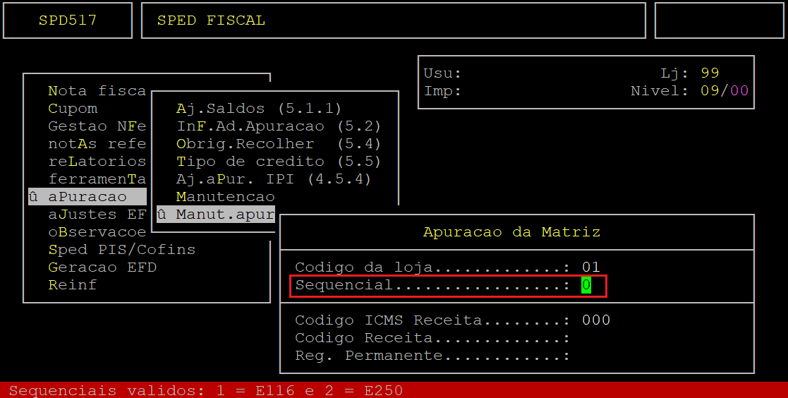 No campo Sequencial, informe o número 1 para configurar o registro E116 para a apuração da matriz, ou 2 para o registro E250.