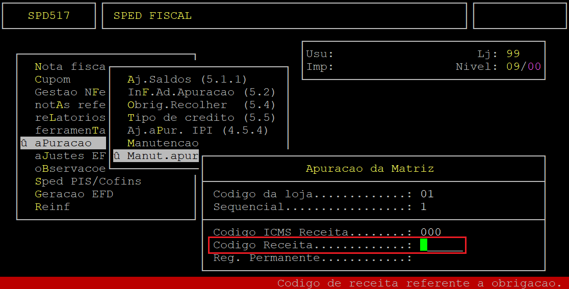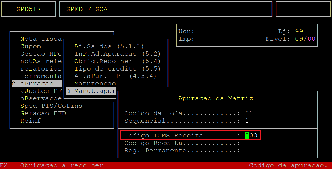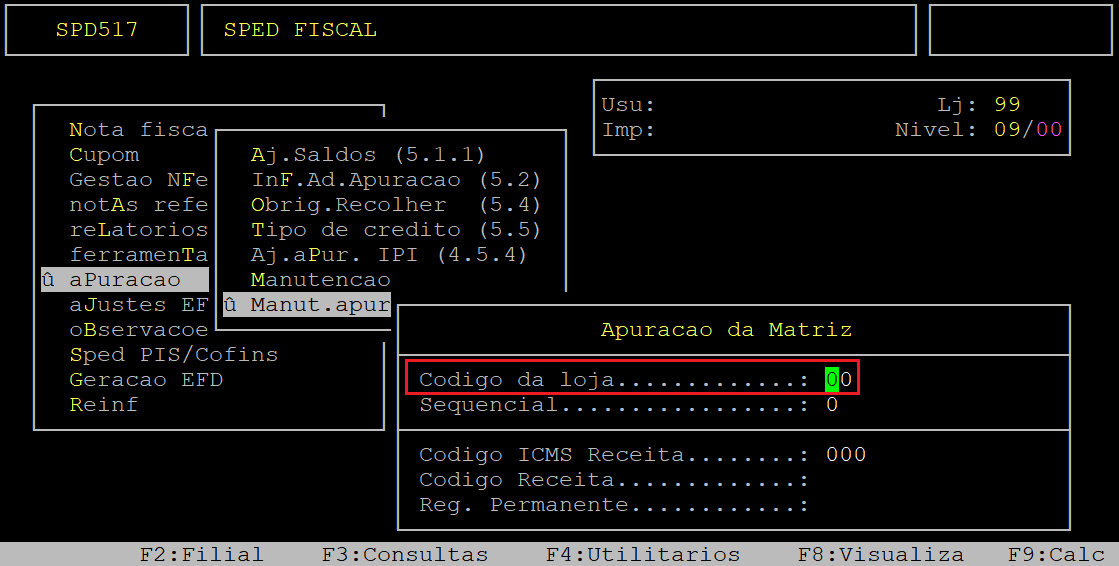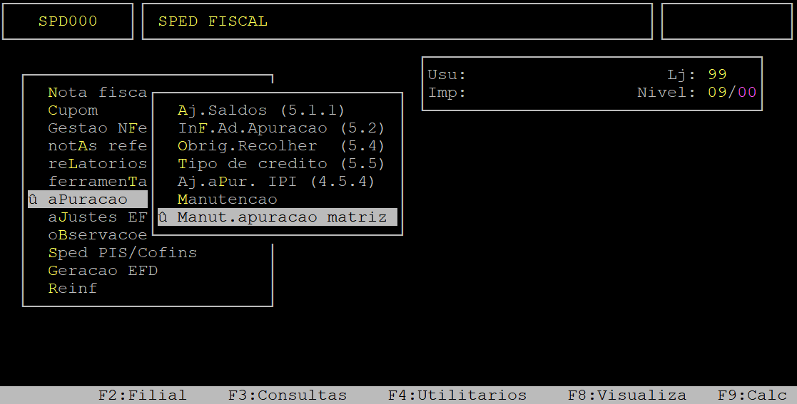 | Localização: | SPED EFD - NFe NFCe / Apuracao / Manut. apuracao matriz |
