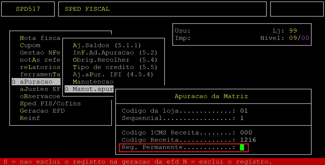 No campo Reg.Permanente, informe a letra S para que o registro a se configurado não seja excluído na geração do Sped, ou N para que seja excluído.