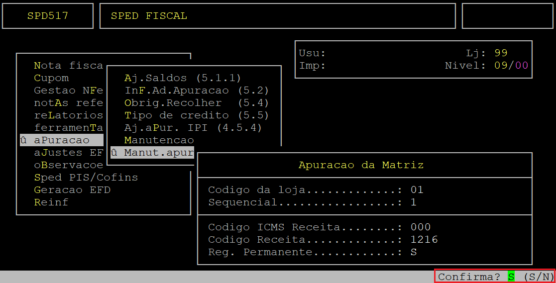 Ao ser exibida a pergunta " Confirma? ", pressione a tecla Enter ou informe a letra S para salvar a configuração do registro.