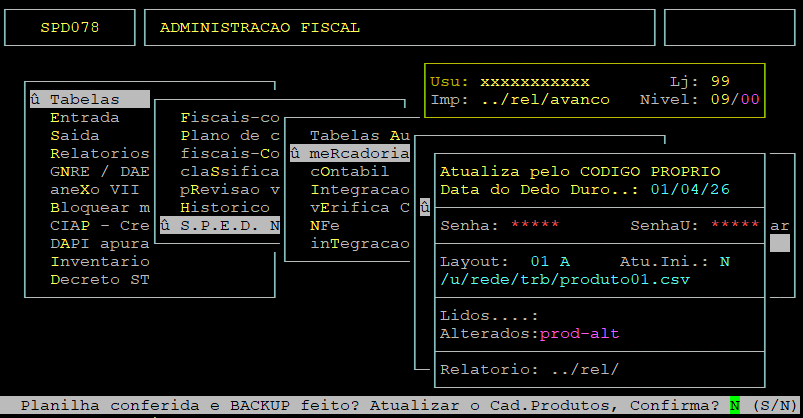 | Localização: | Administracao Fiscal / Tabelas / Sped-NFe / Mercadoria / produtos / Relatorio/ Importa CSV Auxiliar |
