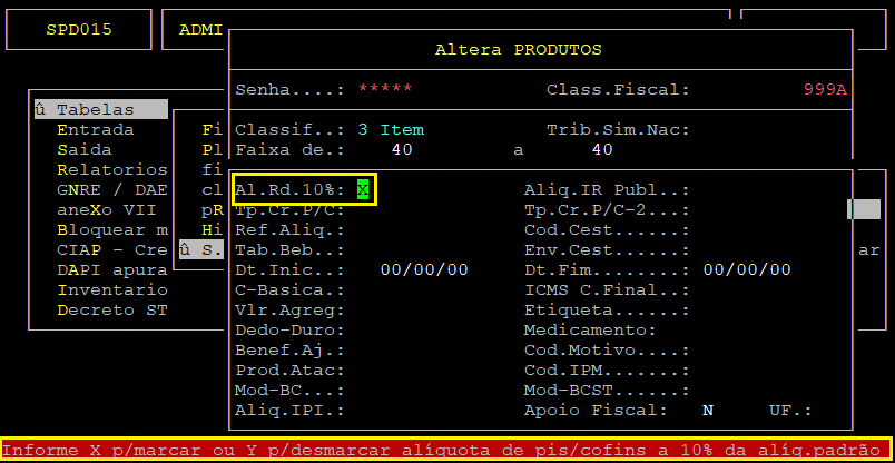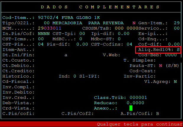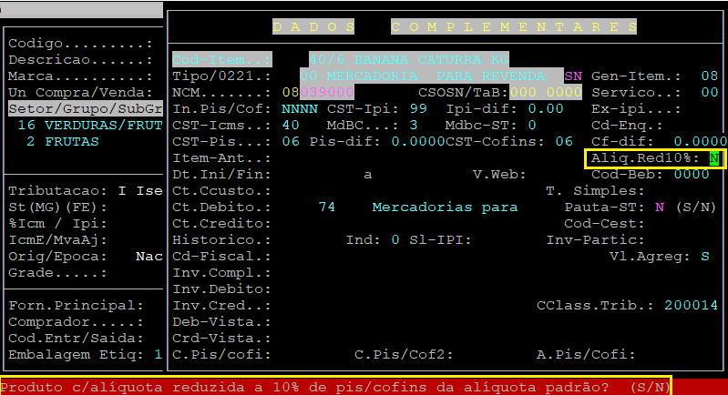 Pressione Enter até alcançar o campo 'Aliq.Red10%' e informe 'S' para identificação. O campo só permite alteração quando o cst de pis e cofins for não incidente.