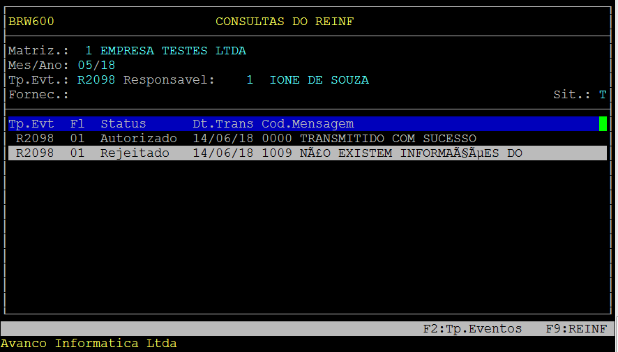 Em seguida digite a Função F9:REINF para visualizar os dados que foram transmitidos referente ao evento, como por exemplo a data do processamento e o recibo.