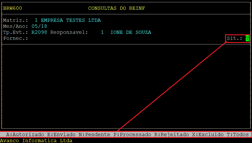 Informe R2098 no campo "Tp.Reg" e logo em seguida, no campo "Sit", informe a situação do evento que irá consultar.