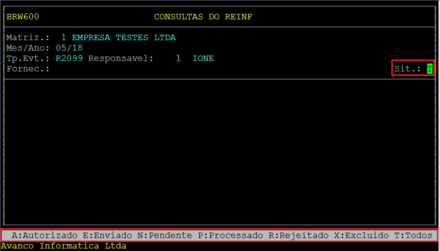 Informe R2099 no campo "Tp.Reg" e logo em seguida, no campo "Sit", informe a situação do evento que irá consultar.