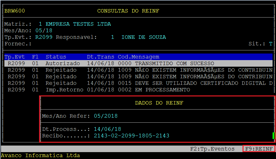 Em seguida digite a Função F9:REINF para visualizar os dados que foram transmitidos referente ao evento, como por exemplo a data do processamento e o recibo.