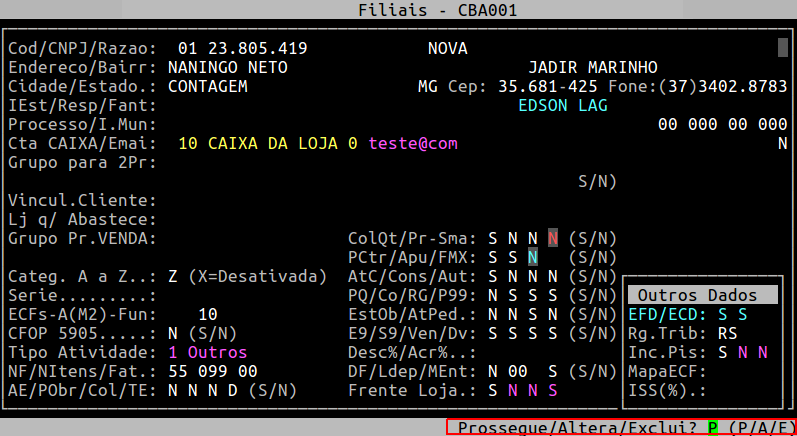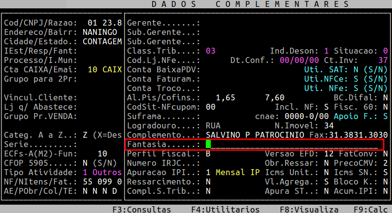 Preencha o campo Fantasia com o nome desejado e pressione Enter até confirmar. Em seguida, pressione a tecla ESC para sair da rotina.