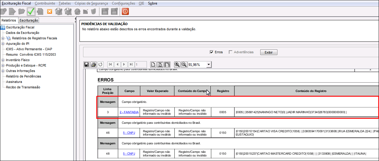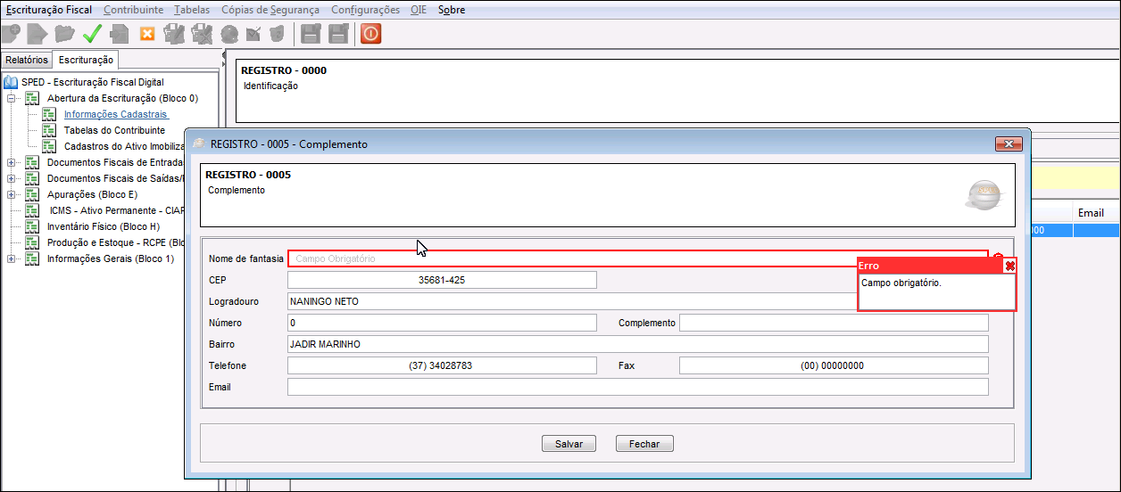 Tela de Exemplo do Erro 2-FANTASIA Registro 0005 no Sped Fiscal