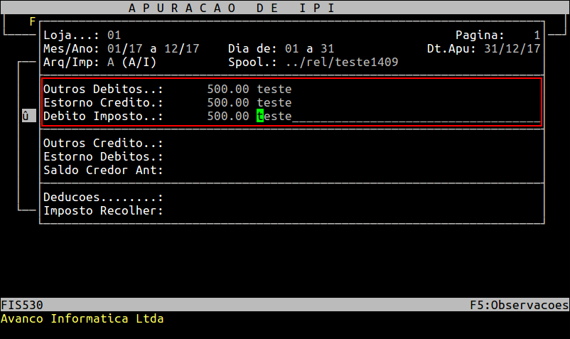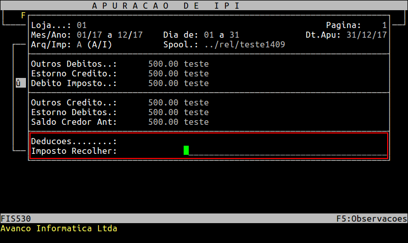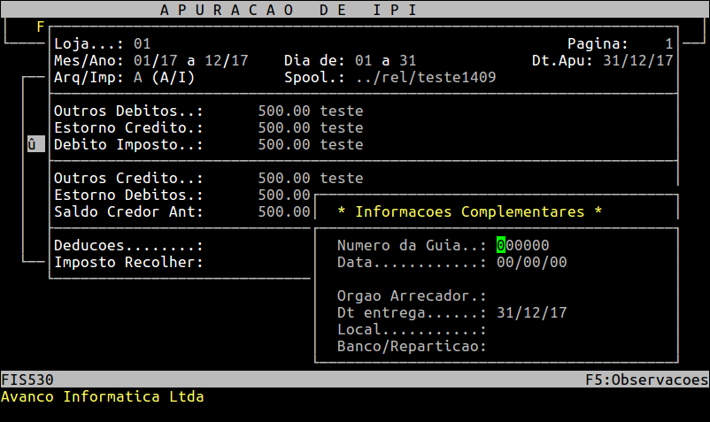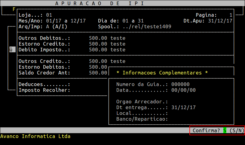 Ao chegar na tela de Informações Complementares, caso não houver outros valores a serem informados pressione Enter até o final da rotina para gerar o relatório (Não é obrigatório o preenchimento dos campos na tela de Informações Complementares), como pode ser observado na imagem a seguir.