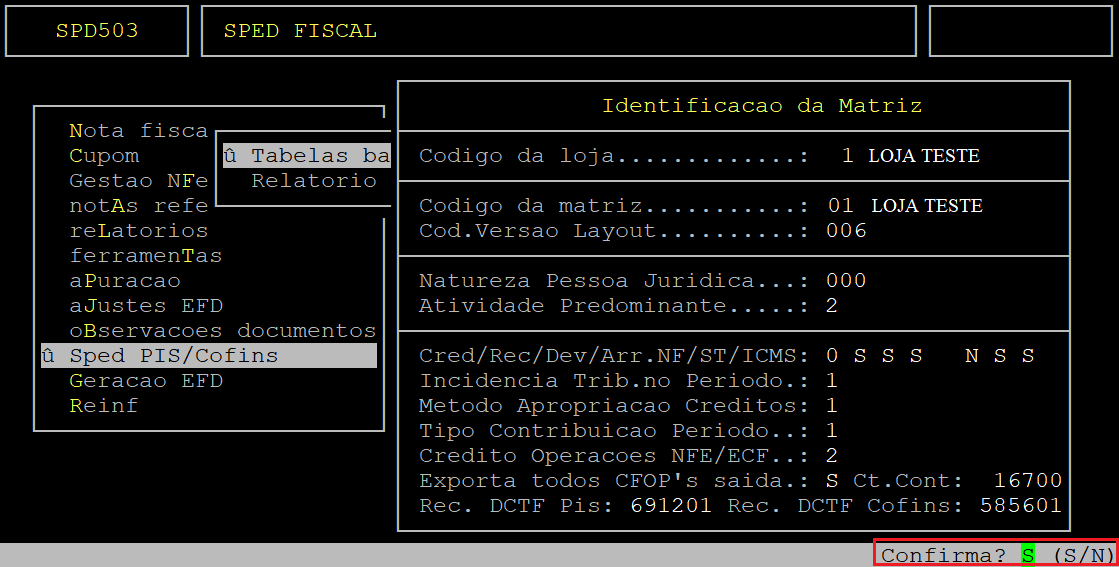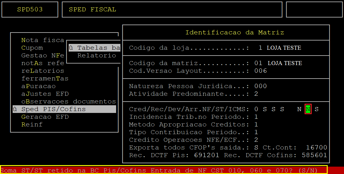 Em seguida, o sistema exibirá a pergunta " Soma ST/ST retido na BC Pis/Cofins Entrada de NF CST 010, 060 e 070? ", no qual deverá informar a letra S para que o sistema some o ST e o ST Retido na Base de Cálculo Pis/Cofins nas entradas de notas fiscais com CSTs 010, 060 e 070.