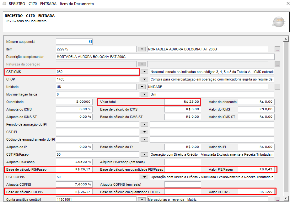 Abaixo segue um exemplo da gravação do Registro C170 - Itens do Documento de uma nota fiscal com a soma do valor do ICMS ST na Base de Cálculo do PIS e COFINS.