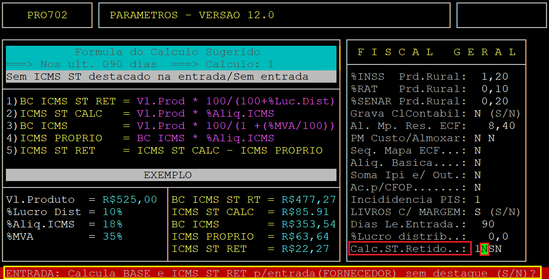 Ao acessar a rotina FISCAL GERAL, pressione a tecla Enter até alcançar o segundo parâmetro do campo Calc.ST.Retido.