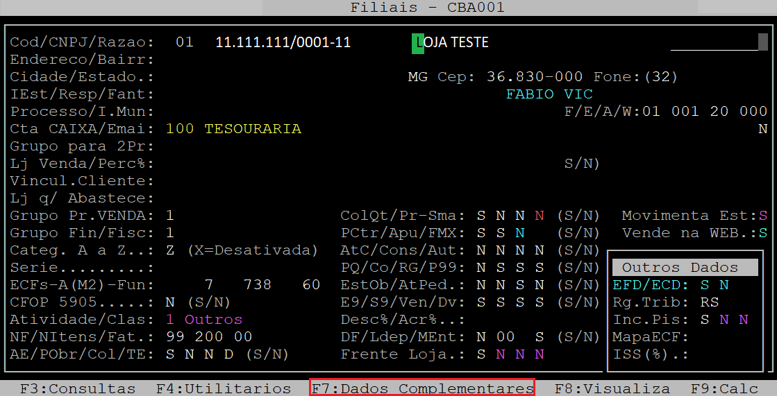 Em seguida, pressione a tecla Enter para alcançar o campo Razao. Em sequência, pressione a tecla F7 para acessar a tela de Dados Complementares.