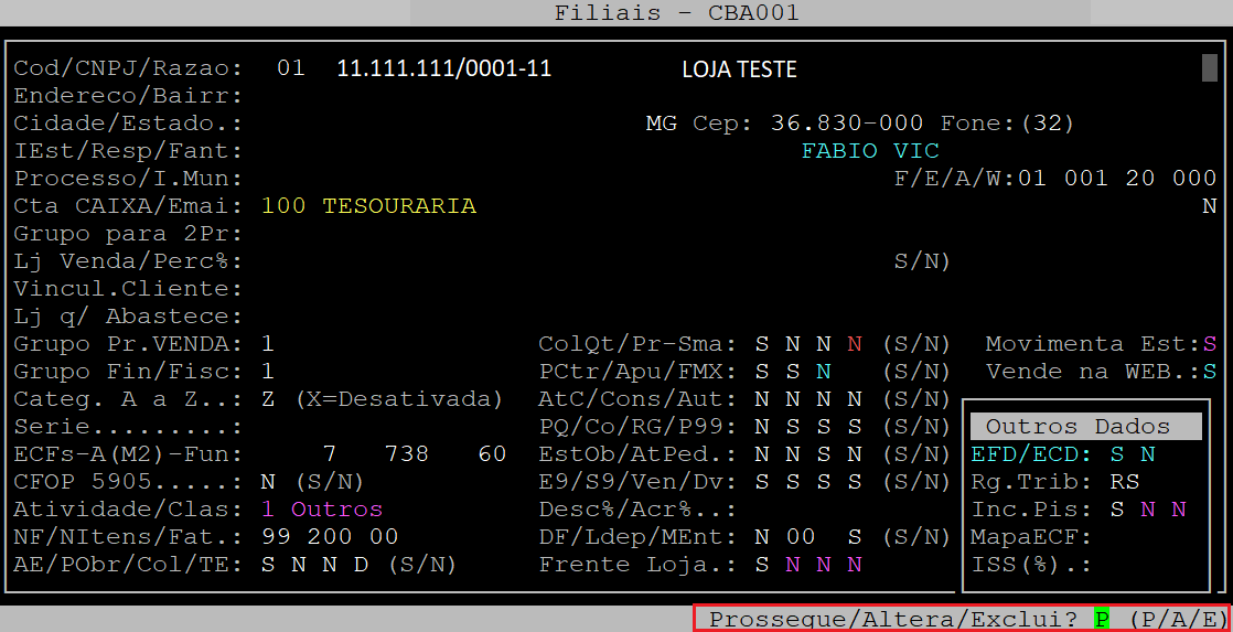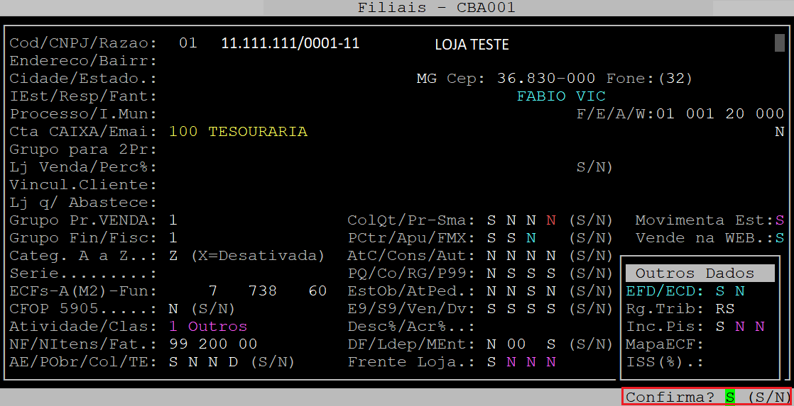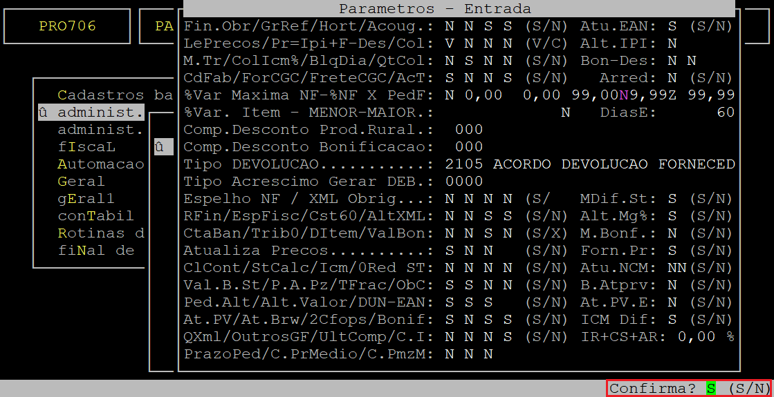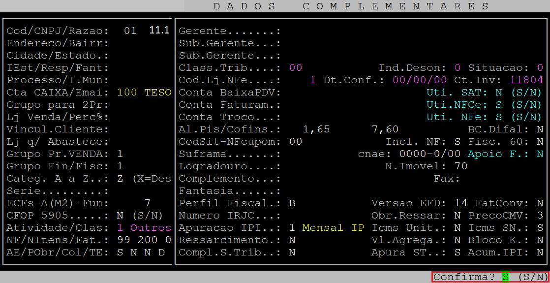 Assim que o sistema exibir a pergunta " Confirma? ", pressione a tecla Enter ou S para acessar a próxima tela.