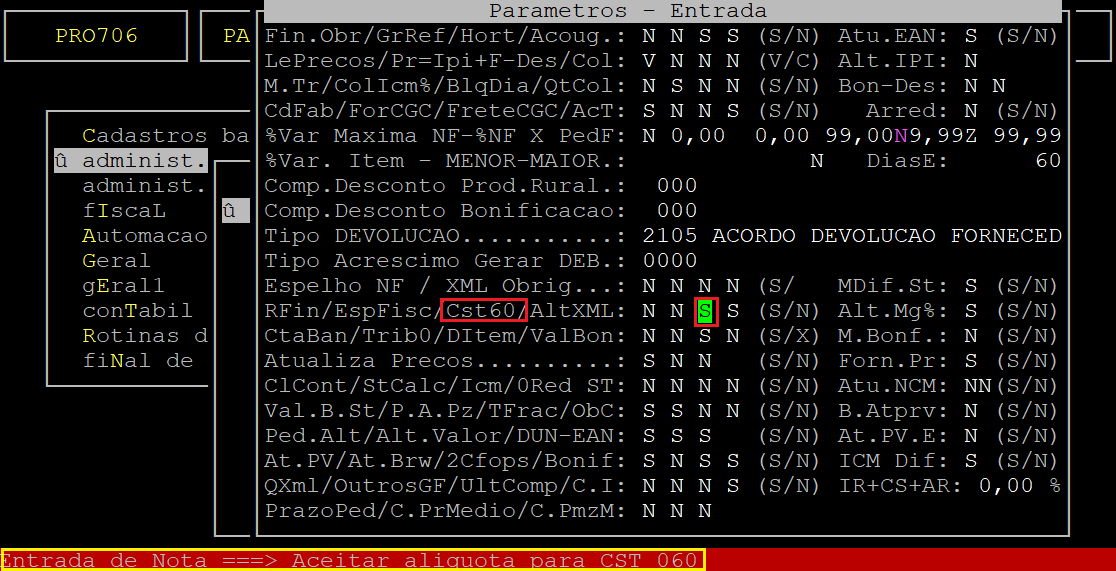 IMPORTANTE: O parâmetro Cst60 é para as notas recebidas com CST 010, no qual ao lançar no sistema com CST 060 o sistema permitirá informar as alíquotas de ICMS se estiver definido com S.