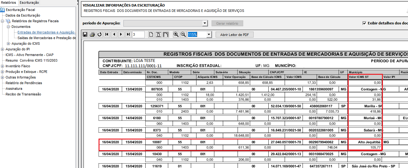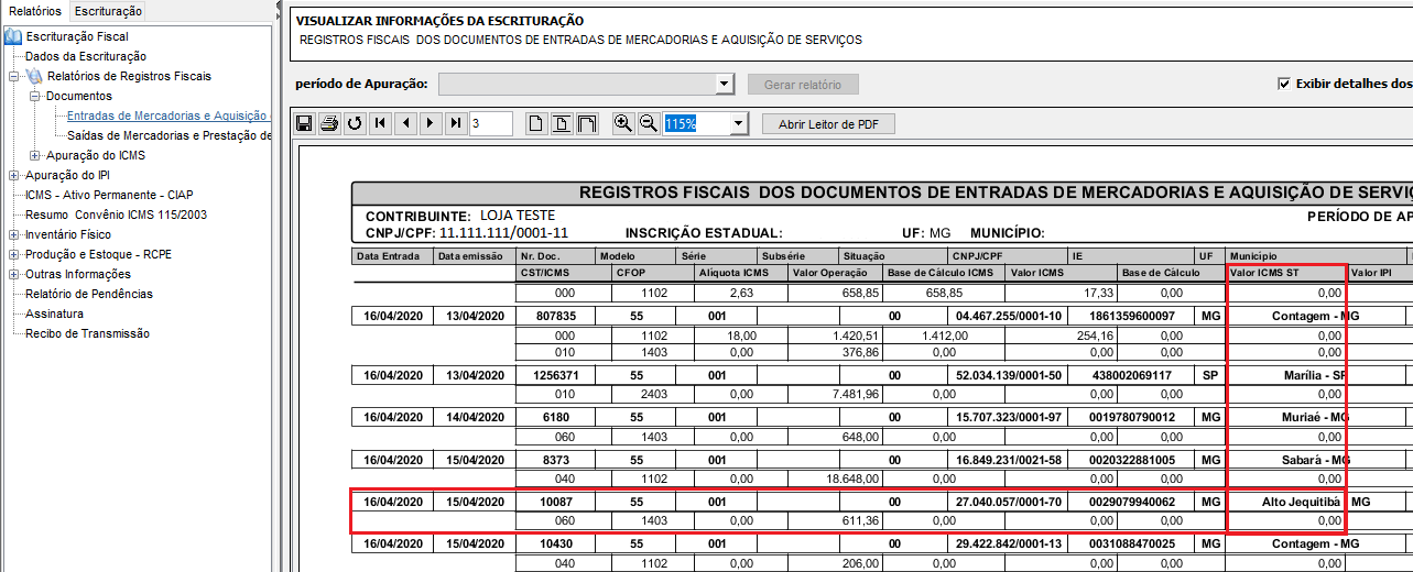 Observe no exemplo abaixo que não foi exibido na coluna Valor ICMS ST o valor de ICMS para o CST 60, referente a nota fiscal 10087, considerando a definição do parâmetro Cst60 com N.