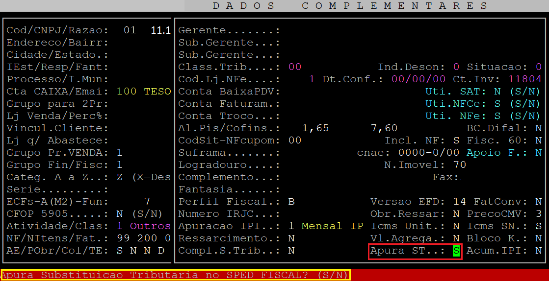 Na tela de Dados Complementares, pressione a tecla Enter para percorrer pelos campos até alcançar o campo Apura ST, no qual deverá informar a letra S.