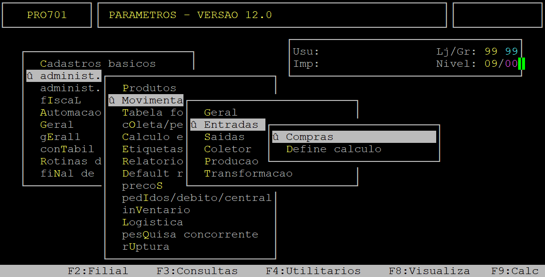 Localização: (Menu Principal) F5 / Administ. Materiais / Movimentacao / Entradas / Compras