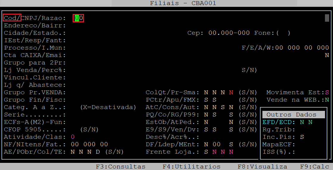 Ao acessar a rotina, informe o código da filial no campo Cod.