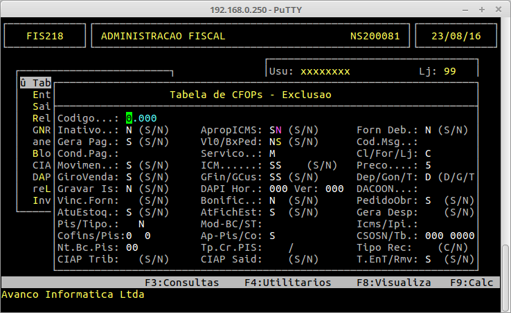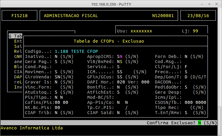 No campo "Codigo", informe o código de CFOP que deseja excluir, pressione a tecla ENTER e confirme a exclusão com a tecla S.